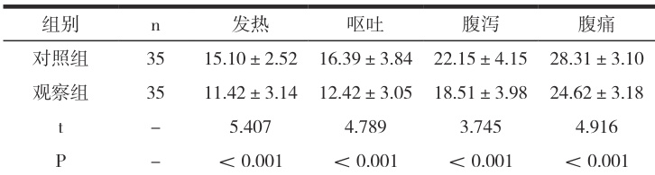 如表 1 所示,观察组患者发热、呕吐等症状消退时间均短于对照组患者,P<0.05 。