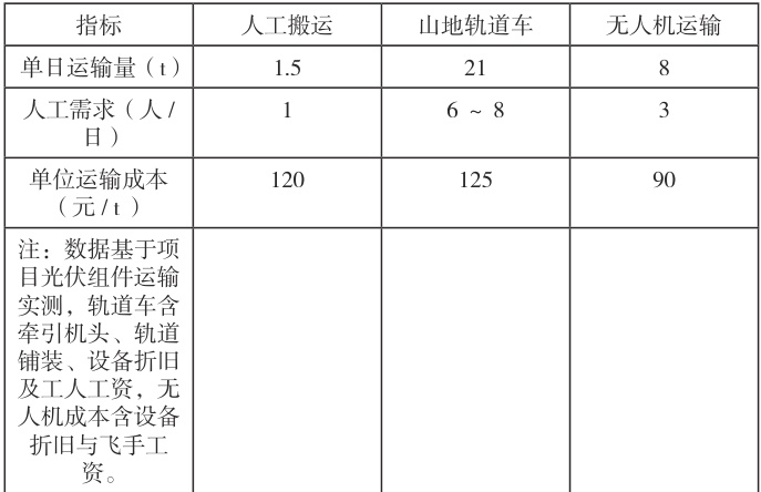 运输成本高昂:方阵区周边既有乡道主要为混凝土路(村村通)或人工修凿的土路,部分现有道路路况较差,主要表现为宽度较窄、坡度大、弯道急、回头弯多,不利于机械设备运输,人工搬运日均效率不足 1500kg ,轨道车需额外投入 1.8~2.5 万元 /km 铺设临时轨道,且临时轨道需反复拆装。