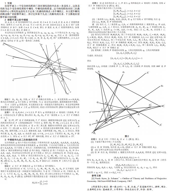 仿射平面上一个完全四线形的三条对顶线段的中点在一条直线上 ,…这条直线称为这个完全四线形的牛顿线 .…牛顿线的性质是 ,…这个四线形的内切二次曲线的中心…( 即无穷远直线关于这条二次曲线的极点)…在牛顿线上.…本文把牛顿线的概念推广的射影平面上 .…并讨它和某个九点二次曲线的关系 .…下文都是在射影平面讨论问题.