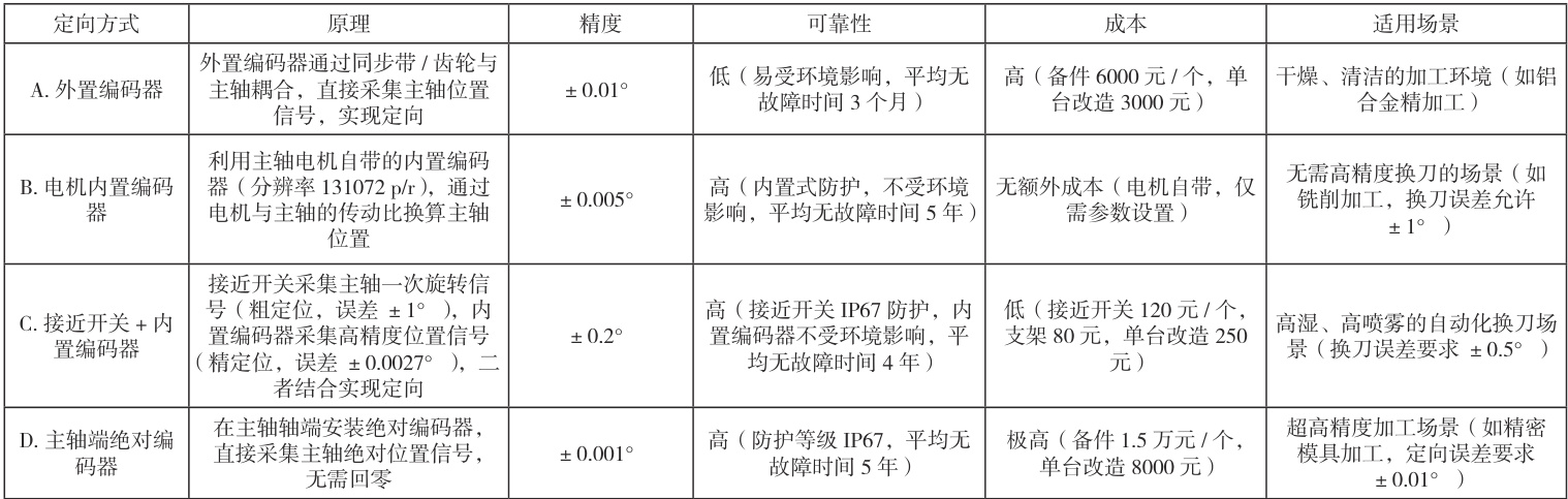 (1)“电机内置编码器 + 接近开关”方案解决了高湿环境下外置编码器失效难题,定向精度满足自动化换刀要求。