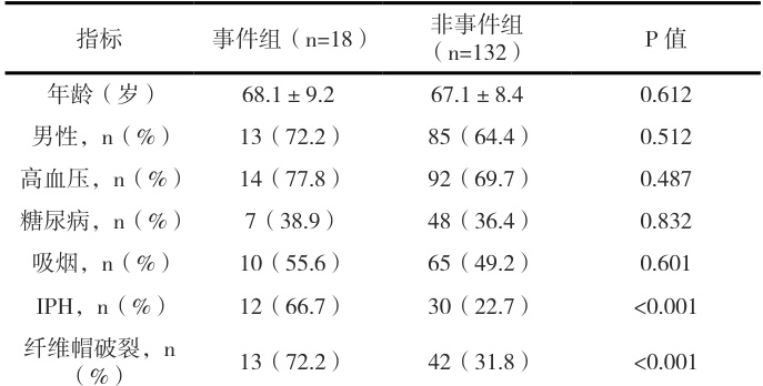 本研究共纳入 150 例颈动脉斑块患者,平均年龄( 67.3±8.5 )岁,男性 98例( 65.3% )。随访 6–12 个月,中位随访时间 10.2 个月,共 18 例( 12.0% )发生脑血管事件,其中缺血性脑卒中14 例,TIA 4 例。