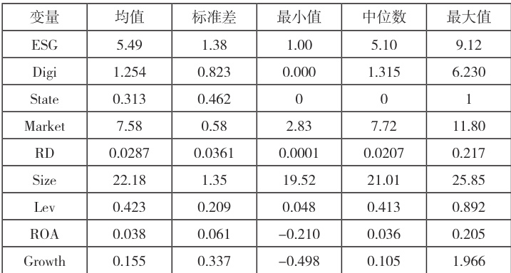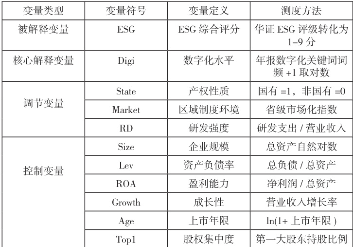 其中,ESGit 表示 i 企业在 t 年的 ESG 综合评分;Digiit 为 i 企业 t 年的数字化水平;Modit 为调节变量(产权性质 State、区域制度环境Market、研发强度 RD);Controlsit 为控制变量集合;μi 表示个体固定效应;λt 表示时间固定效应;εit 为随机误差项。考虑到 ESG 实践的持续性特征和内生性问题,模型进一步引入以下处理:①核心解释变量与调节变量采用滞后一期处理;②对可能存在的遗漏变量问题,纳入行业- 年度交互固定效应;③针对样本选择偏差,采用倾向得分匹配(PSM)构造对照组。