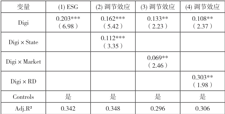 (二)回归结果分析表 3 给出了固定效应模型回归结果。列(1)显示,数字化水平(Digi)系数为 0.203(t=6.98),在 1% 水平显著,表明企业数字化水平每提升1 单位,ESG 综合评分平均提高0.203 分,H1 得到验证。