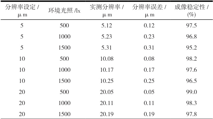 表1 视觉传感系统成像性能测试结果