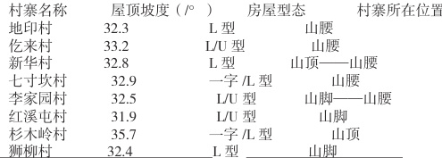 由上表(表 2-1)可以看出,研究村落的具体所在位置,限于环境,都位于山体的山顶、山腰或山脚,其房屋屋顶坡度较陡,都在32° -36°之间。在房屋的朝向选择上,各村落没有统一的屋顶坡度,房屋朝向都是根据当地地形而定的。