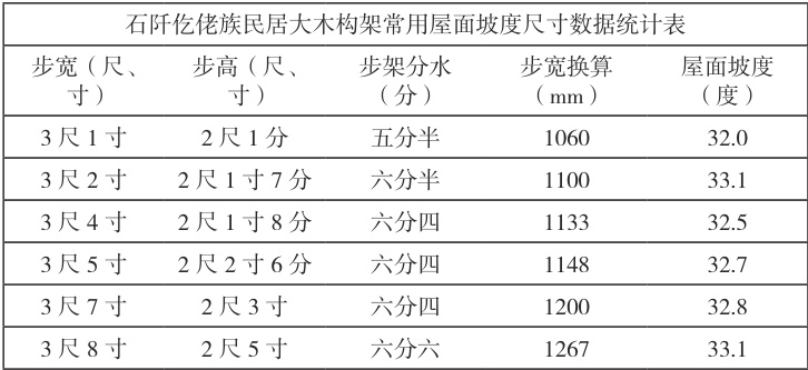 木匠师在确定中柱高度和步架宽度以后,根据屋面坡度和对应的步架高度即可依次推算出其余柱高尺寸。仡来村仡佬寨的民居屋面基本上都采用直坡式竹竿水,从屋脊至檐口坡度统一,但其常用坡度又有一些地方差异。仡来村民居大木构架中相邻柱子间的高差俗称“倒水”,本地木匠有易于记忆的尺寸口诀与之对应。所谓“3 尺 3 的洞 子,2 尺 1 寸 5 倒水;3 尺 4 的洞子,2 尺 1 寸 8 倒水;3 尺 5 的洞子,2 尺 2 寸 5 倒水 ;3 尺 6 的洞子,2 尺 3 倒水 ;3 尺 8 的洞子,2 尺 5 倒水”。虽然不同步架宽度 对应的坡度略有差异,但基本都在六分半左右,较石阡地区传统民居常用的五分水更陡。而仡佬族村民居的屋面坡度主要采用五分半的水,若平缓一点也可采用五分四的水。其步架高度与步架宽度相互对应,如 2 尺 5 的步宽,五分半的水对应 1 尺3 寸5 的步高,五分四的水则对应 1 尺 3寸 8 的步高。