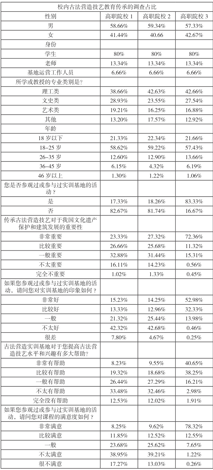 为明确高职院校学生、教师及基地运营人员对技艺传承的看法、态度及基地认知,调查覆盖3 所高职院校共450 人:通过线下/ 电话访谈、含单选/ 多选/ 量表题的网络问卷收集数据,对学生采取分层抽样以丰富样本代表性。