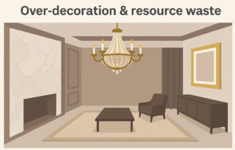 在一些商业和住宅空间中,设计师过度追求视觉效果与奢华氛围,大量使用高档装饰材料和复杂工艺,导致施工能耗与材料浪费严重。这不仅增加了项目成本,也背离了绿色建筑倡导的节约原则。此外,过度装饰往往忽视功能性和实用性,造成空间使用效率下降,甚至在后续维护中需要投入更多资源,从而进一步加剧了环境负担,如图1。