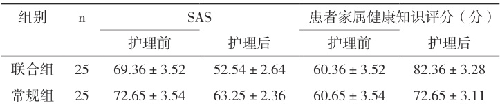 护理后,两组 SAS 评分均下降、健康知识评分均升高,且联合组 SAS 评分低于常规组、健康知识评分高于常规组(均 P<0.05 )。