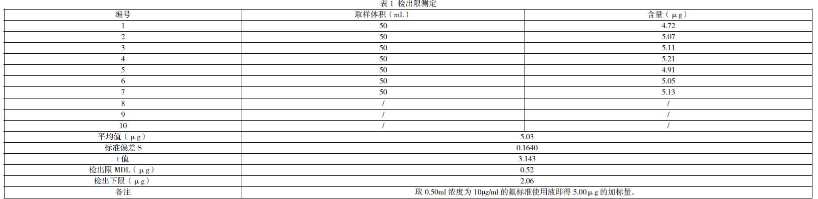 本文对加标量为 5.00μg 的滤膜样品进行了 7 次测定,计算 7 次平行测定结果的标准偏差 S 为 0.1640c 。当采样流量为 50L/min,采样时间为 1h 时,计算出环境空气中氟化物的检出限为 0.2μg/m3 ,测定下限为 0.8μg/m3 。结果见表 1: