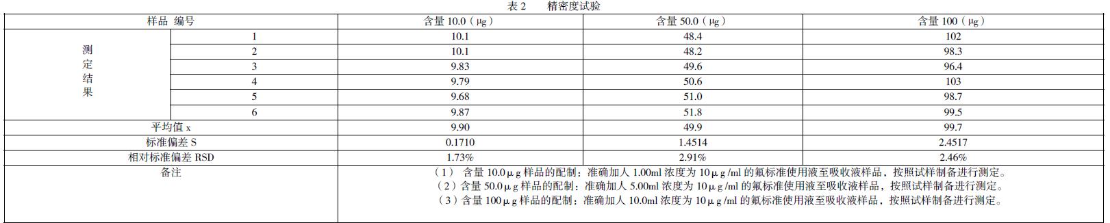 本文分别对氟化物加标量为10.0μg、50.0μg 和100μg 的滤膜样品按试验方法进行了6 次重复测定,结果见表2: