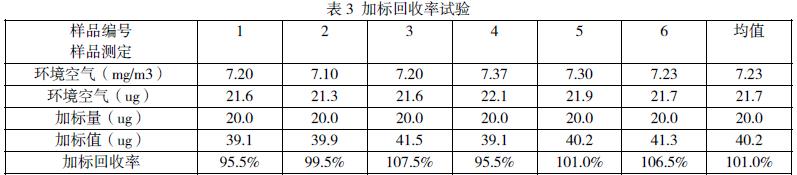 用本方法对某一环境空气进行了 6 次氟化物测定,采样流量为 50L/min,采样时间 1h。并且分别对其进行了6 次加标量为 20.0μg 的加标测试。结果见表 3: