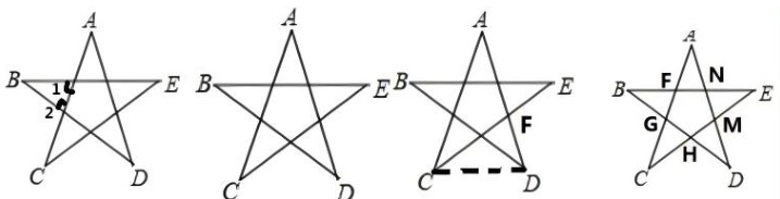 ∴∠A+∠AFN+∠ANF+∠ENM+∠EMN+∠E+∠DMN+∠DHN+∠D+∠CHG+∠CGH + ∠ C+ ∠ B+ ∠ BGF+ ∠ BF G=900∘ °∴∠ A+ ∠ B+ ∠ C+ ∠ D+ ∠ E=180°