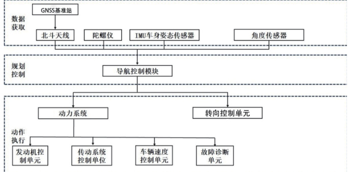 本文创新点在于:(1)构建“北斗 + 惯导”组合导航系统,提升丘陵环境定位稳定性;(2)设计分层控制架构,优化路径规划与执行精度。