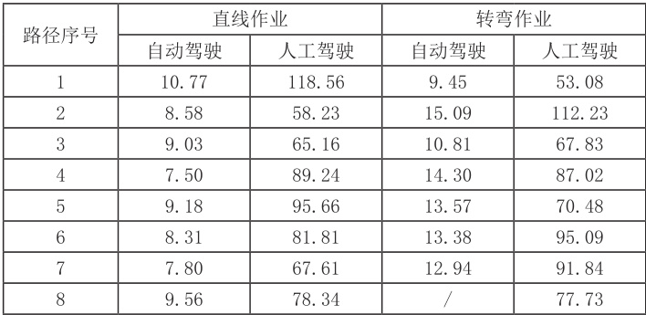 为了分析两种驾驶方式的动力控制性能,表 1 分别对比了直线作业和转弯作业时发动机的转速标准差。试验数据表明直线作业时,自动驾驶的平均转速标准差为 8. 84r/min ,显著低于人工驾驶的 89. 6r/min ,转弯作业时自动驾驶时发动机转速标准差为 12. 79r/min ,人工驾驶时发动机转速标准差为 81.91r/min,这说明自动驾驶时的动力输出更稳定。