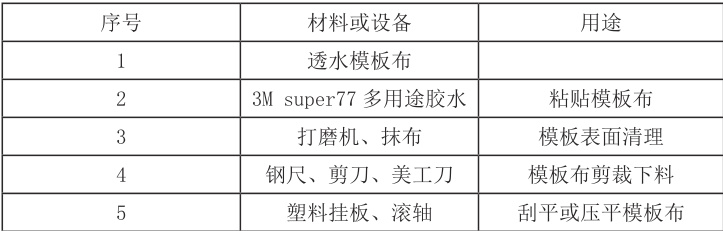 (2)模板布施工前应对作业人员进行分组,安排如下:一人测量模板布尺寸、一人裁剪、一人喷胶、三人铺贴,其中一人负责固定,两人负责摊铺和粘贴。