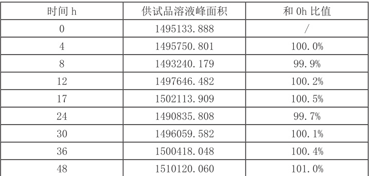 供试品溶液在各个时间点主成分峰面积与 0h 峰面积的比值均在 98.0%~ 102.0% 范围内,供试品溶液在控温 25℃条件下 48h 内稳定。