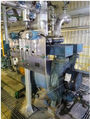 某蒸馏装置减压真空泵 P-209, 为美国格雷汉姆真空热传导技术有限公司生产,设备型号:2PV91670,该泵主要作用是减压塔顶的辅助抽真空设施,对减压塔真空度有重要影响,属装置关键设备,介质为循环水、瓦斯、减顶不凝气等。其中减顶不凝气中富含 H2S,浓度检测达到 125000mL/m3。该泵原设计选型为单端面多弹簧机械密封。近年来随着环保法规(如 GB37822-2019《挥发性有机物无组织排放控制标准》)加严,各企业环保督查及异味治理管控升级,该泵原单端面机械密封已不能满足机泵周围 1 米内无异味的管控要求。经过技术团队的攻关,从改变机械密封结构和冲洗方式入手,采用干气密封解决了机械密封泄漏、VOCs 监测超标的难题,消除了设备隐患,达到了挥发性有机物减排的目的。