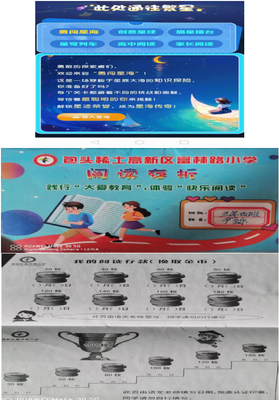 1. 能借助AI 技术制定阅读计划,并按照阅读进度执行。学生对自己感兴趣的内容进行深入探索时,他们会更有动力去学习和思考。2. 根据评价的工具,采用观察式,在课堂中观察阅读专注度、交流阅读的次数;采用记录式,通过《阅读存折》、图书馆借阅登记表、阅读星级评定表,了解自己阅读的兴趣及持续力。为树立榜样,学校采用个人自荐、班级推荐、年级初审、学校评审,通过层层选拔,每月评选“阅读之星”予以公布表彰。3. 根据物化成果,从创造美文集、制作的绘本和小报等物化成果的质量,对学生兴趣和能力进行评价。4. 根据可量化的纸质测试与阅读活动参与度分级评价。通过“云端 + 课堂双线”交流,构建“人—书—网”实现线上线下多维度、多样化的阅读学习。