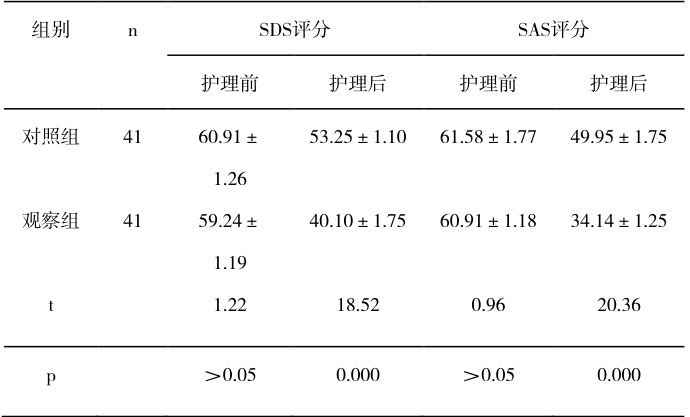 1.3 观察指标 护理前后采用焦躁自评量表(SAS)和抑郁自评量表 (SDS)对患者的焦躁和抑郁水平进行评估。