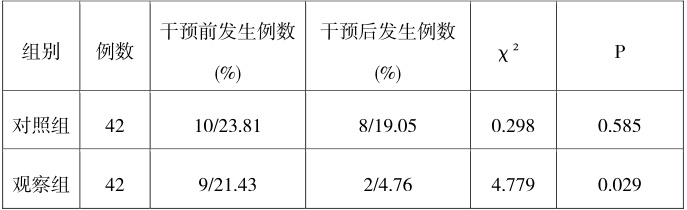 2.1 输液相关并发症发生率比较 干预前,两组患者的输液相关并发症发生率对比,差异无统计学意义( P>0.05 );干预后,观察组患者的并发症发生率低于对照组,差异有统计学意义( P<0.05 ),见表 2
