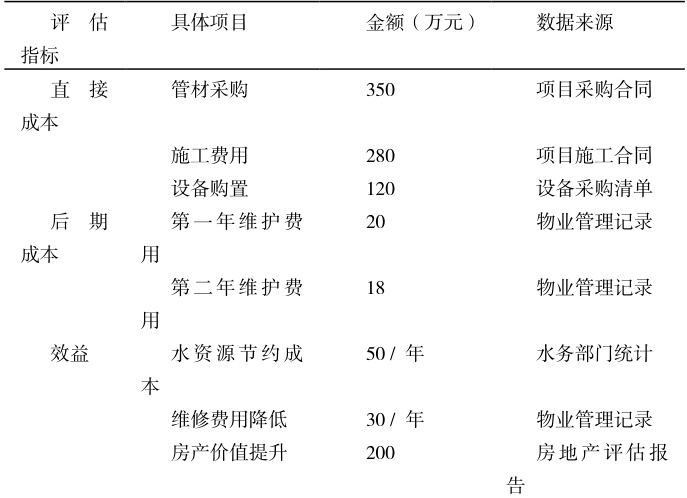 表 1 某老旧小区给排水管网改造经济效果评估数据表