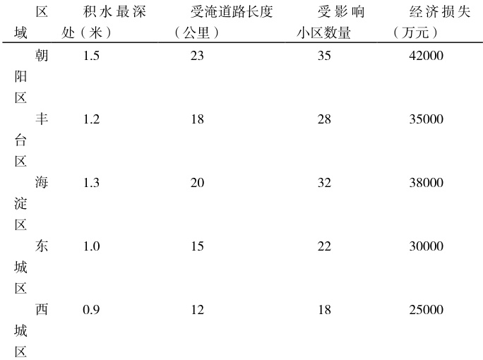 以北京 “7・ 21” 特大暴雨事件为例,当日全市平均降雨量达 170 毫米,城区部分地区降雨量超过 200 毫米。由于排水系统存在上述诸多问题,致使城市多处出现严重积水,部分路段积水深度超过 1 米,交通瘫痪,大量车辆被淹,据统计,此次灾害造成 79 人死亡,直接经济损失达 160.2 亿元【1】。该事件充分暴露了城市排水系统在应对极端降雨时的脆弱性,凸显了升级改造的紧迫性。见表 1 北京市“7・ 21” 特大暴雨部分受灾区域情况。