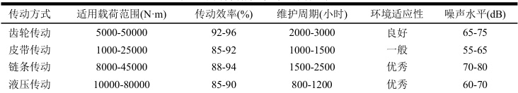 表 1 数据显示不同传动方式在载荷承受能力与传动效率以及维护要求这些方面存在明显差异,齿轮传动在中高载荷工况下能够保持最高的传动效率,液压传动虽说效率相对较低但载荷适应范围是最广的,皮带传动在轻载条件下具备噪声低这样的优势,链条传动在恶劣环境中表现出最强的适应能力。