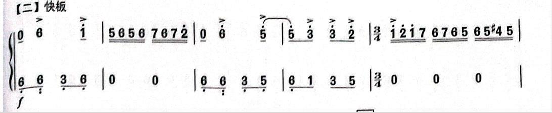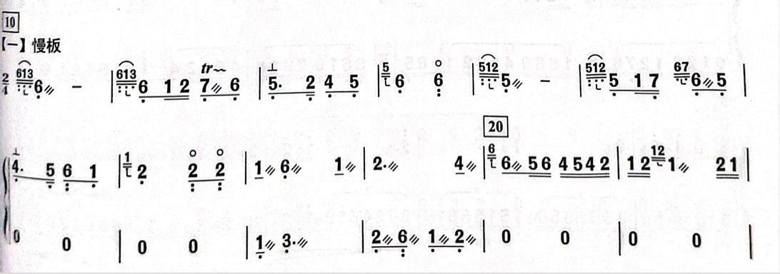 慢板节奏是 2/4 拍,节奏比较缓慢,朴素的旋律展现出低沉的感觉,我们看到中低音 7 的上方有一个演奏技法符号,是颤音,颤音比波音的时值长,演奏的时候注意音的时值,中低音5
