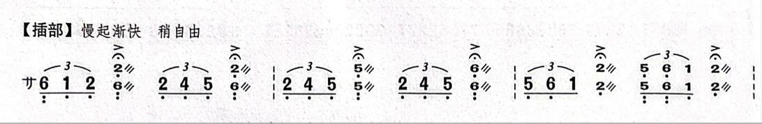 插部这一段开头慢起渐快,三连音和重音的出现,加强了层次感与戏剧性,把情感从低沉转向了豪放,音乐从低音区的凄凉转向高昂的旋律中去,旋律从 G 调转为 F 调回忆部分转到 D 调,形成调性对比,音乐的交替演奏展现出了屈原坚持理想的不屈精神,通过力度变化和对音色的对比,又加了重音的技法,传递出了屈原愤懑的情绪,插部段落还有大部分的滑音,快速轮音等演奏技巧,需要我们在这里多加练习,带入情感来进行演奏。