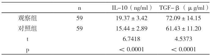观察组患者的 IL-10、TGF- β 水平明显优于对照组,且差异具有统计学意义( p<0.05 ),详见表1 :