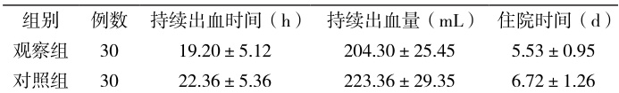 观察组止血成功率为 96.67% (29/30),高于对照组的 80.00% (24/30),观察组止血效果优于对照组, P<0.05AA 。见表 1。