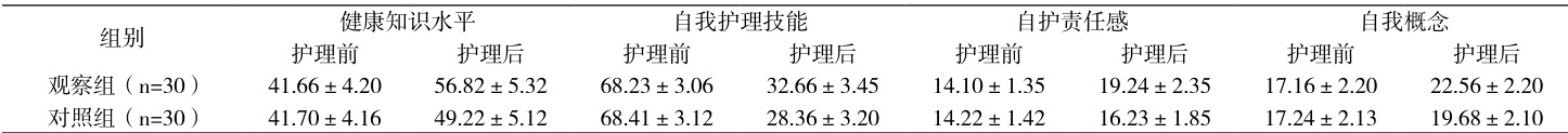 观察组(护理后)自护能力评分更高, P<0.05 。见表 2
