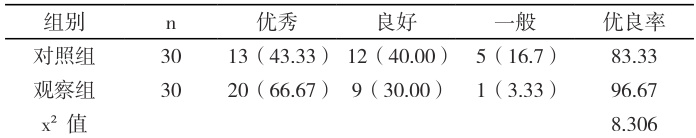 观察组患者干预后生殖健康知识认知优良率显著高于对照组,两组数据比较,P<0.05 。见表 1。