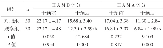干预后,观察组患者 HAMD 和 HAMA 评分均显著低于对照组,两组数据比较,P<0.05 见表 2