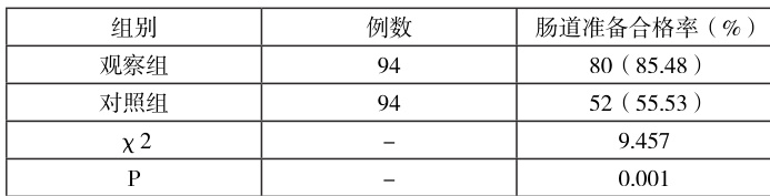 表中显示,观察组共有94 例患者,其中80 例(85.48%)达到了肠道准备的合格标准;而对照组94 例患者中,只有52 例(55.53%)达到了同样的标准。χ 检验结果显示,两组之间在肠道准备合格率上存在显著差异,P 值为0.001(<0.05),结果表明,在结肠镜检查前,品管圈活动能有效地提高肠道准备的合格率。