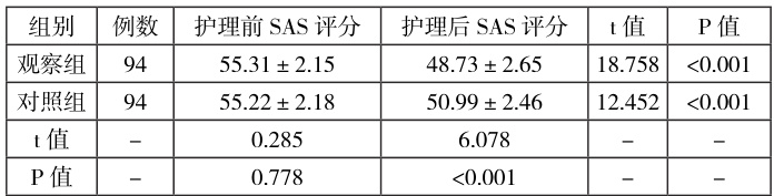 采用焦虑自评量表(SAS)对护理前后焦虑程度进行评定。该量表由多种项目组成,反映了患者的各种情绪状态,如焦虑、紧张和恐惧等。从 50 分到 69 分,焦虑程度不同,分为轻,中,严重三种。通过对对照组与观察组患者焦虑评分的比较,探讨品管圈活动对病人心理状态的影响。