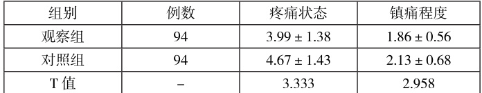 观察组与对照组的舒适度对比见表3。观察组中,94 例患者的平均疼痛状态评分为3.99±1.38,显著低于对照组的4.67±1.43(T= 3.333, P = 0.001)。此外,观察组的平均镇痛程度评分为 1.86±0.56,明显低于对照组的 2.13±0.68(T = 2.958, P = 0.004)。这说明在结肠镜检查过程中,引入品管圈活动,可以有效提高病人的舒适程度。