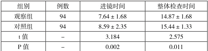 比较两组患者结肠镜检查的进镜时间及总检查时间的差别。结果显示,观察组的进镜时间和整体检查时间均显著短于对照组,差异具有统计学意义(P < 0.05),详细数据见表4。表4 检查时间比较