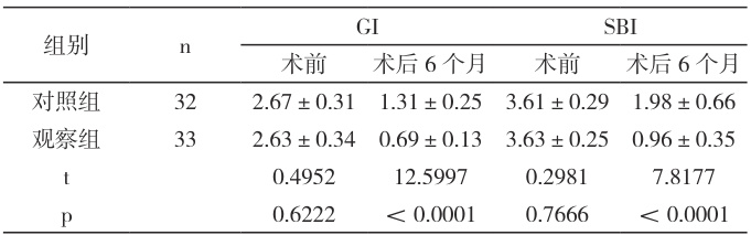对比观察两组牙龈指数(GI)、龈沟出血指数(SBI)。