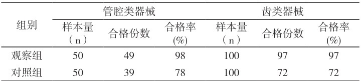采用两种清洗方法清洗后通过表 1 可知,观察组管腔类器械和齿类器械目测的洁净度合格率分别为 98% 和 97% ,对照组管腔类器械和齿类器械目测的洁净度合格率分别为 78% 和 72% 。观察组洁净度合格率明显高