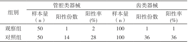 采用两种清洗方法清洗后通过表 2 可知,观察组清洗后管腔类器械和齿类器械检测的阳性率分别为 2% 和 1% 。对照组清洗后管腔类器械和齿类器械检测的阳性率分别为 28% 和 36% ,观察组阳性检测率明显低于对照组 [3]。