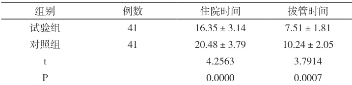 对比表1 内的住院及拔管时间:试验组短于对照组( P<0.05 )。
