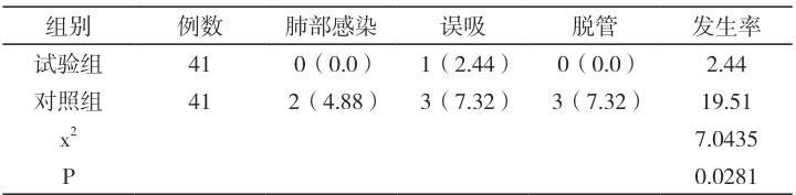 试验组增加使用针对性措施:(1)仔细清洁并消毒病房,调整室温至24∘C 左右,且室内还要保持良好的通风。每日按时用含氯消毒液擦拭仪器及设备表面,并做好管道接口的消毒工作。为避免交叉感染,还应严格控制探视频率与人数。(2)调整气囊压力在 25-30cmH2O 的范围之内,并每隔 4h 对仪器和设备的工作情况进行 1 次检查。观察病人呼吸状态,并固定好各管道,防止管道出现受压与脱出等问题。及时清理病人呼吸道中的分泌物,若病人呼吸不畅,可用 0.9% 氯化钠溶液对病人的呼吸道进行清洁。(3)予以病人营养支持,可采取鼻饲的方式,向病人输注营养液,且在鼻饲的过程中,还应让病人取半卧位,并控制营养液输注的速率在 40-80ml/h 的范围之内。(4)仔细查看病人伤口情况,若敷料被污染,需立即更换。按需吸痰,并在吸痰后,对病人施以吸氧治疗。若痰液黏稠,需予以病人雾化治疗。(5)观察病人情绪与面色等的变化,可为病人播放舒缓的乐曲,让病人能放松身心。积极安抚病人情绪,也可酌情使用点头、握手与拍背等肢体语言。(6)利用图文及视频等,向病人与家属普及疾病知识,介绍气管切开的目的与流程。耐心解答病人和家属所提出的问题,同时向他们介绍预后较好的气管切开案例。(7)强化体位管理力度,且在协助病人翻身后,还要按摩病人的肢体,以免病人出现压疮等问题。每周更换1 次器官套管,且在更换的过程中,还应落实无菌操作原则。