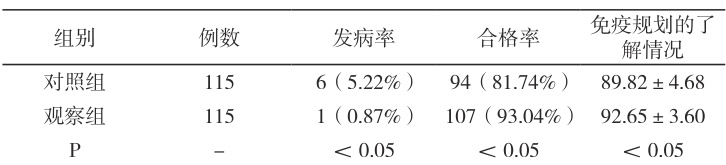 表2 比较两组儿童的的发病率、合格率、儿童家长对免疫规划的了解情