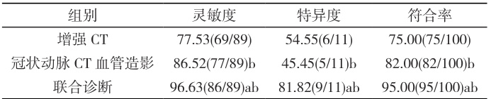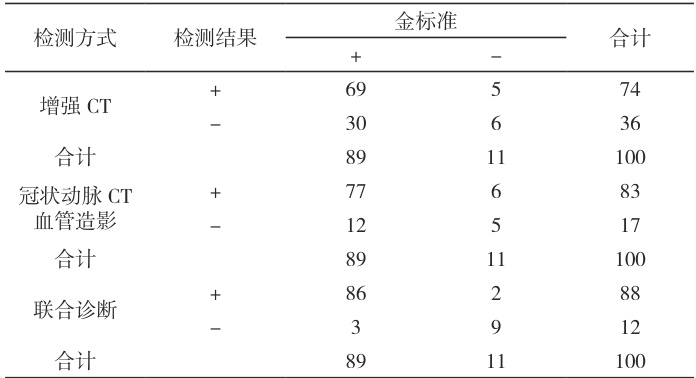 表 1,金标准方式共检出阳性 89 例,阴性 11 例;其中冠脉 CT 血管造影共检出真阳性77 例,真阴性5 例;增强CT 共检出真阳性69 例,真阴性5 例。联合诊断共检出真阳性86 例,真阴性9 例。
