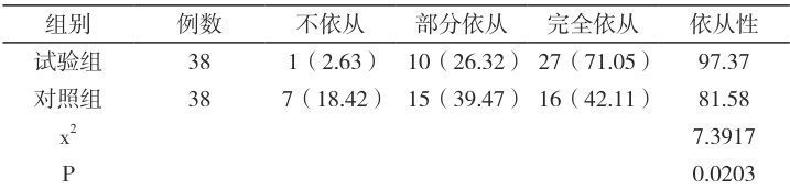 2.1 依从性分析对比表1 内的依从性:试验组 97.37% ,对照组 81.58% , P<0.05 。