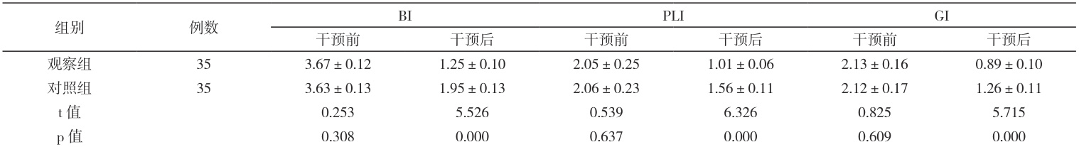 干预前两组 BI、PLI、GI 差异小( P>0.05 ),干预后观察组 BI、PLI、GI 均低于对照组( P<0.05 )。