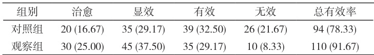 治愈:症状完全消失;显效:哮喘发作次数减少 ⩾70% ,症状明显减轻,肺部哮鸣音明显减弱;有效:哮喘发作次数减少 30%-70% ,症状有所减轻,肺部哮鸣音有所减弱;无效:未达到上述标准。