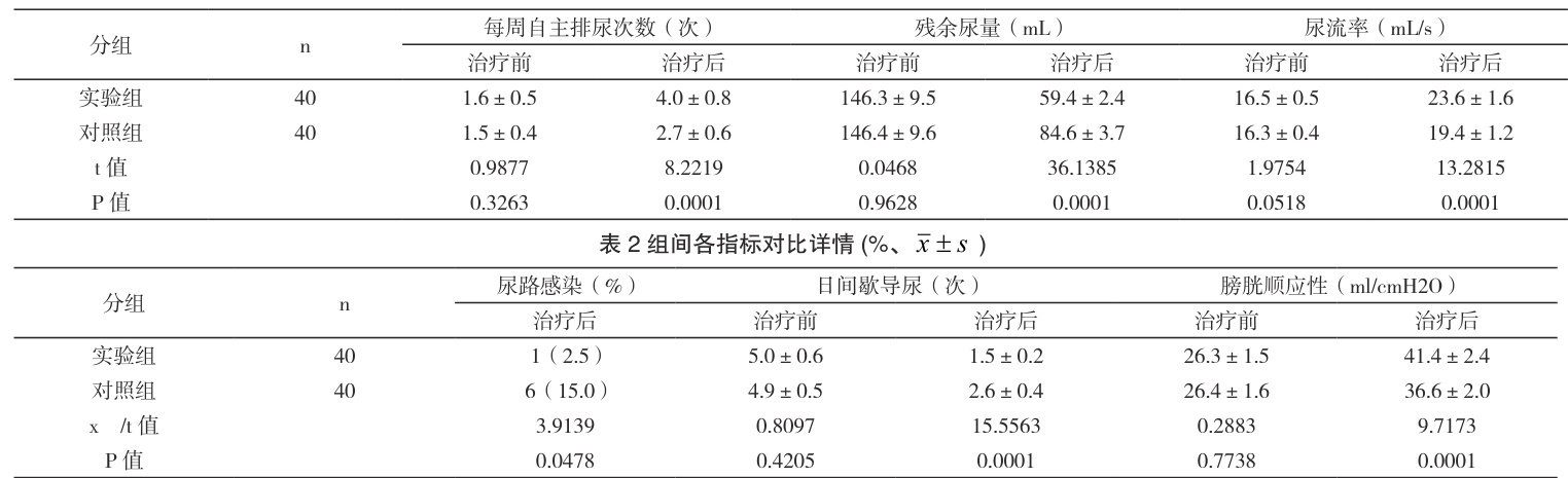 1)记录对比两组患者每周自主排尿次数、尿路感染发生情况、日间歇导尿次数。2)通过超声测量治疗前后两组患者的残余尿量;运用尿动力学检测两组患者治疗前后的尿流率和膀胱顺应性。